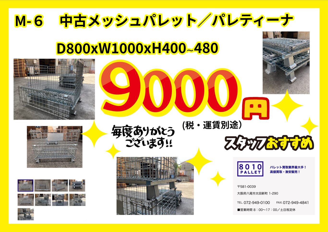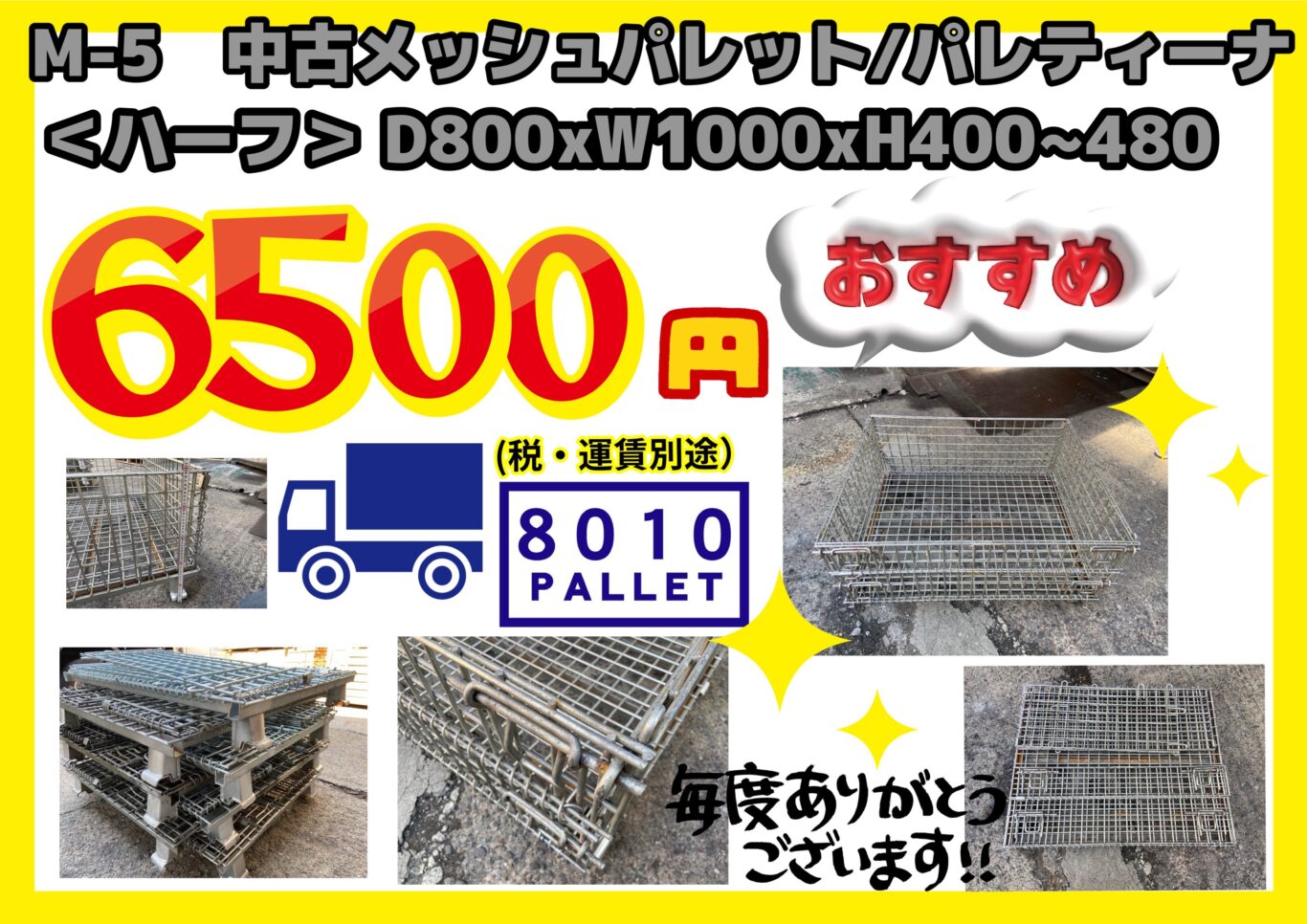 M-5中古メッシュパレット(ハーフ)D800xW1000xH400~H480本体の高さがH400とH480があります。H(高さ)は脚高90~100㎜を含みます。選べません。※中古品ですので、サビ・歪み等あります。ご了承ください。※個人様宅への配達、発送はできません。株式会社8010 (パレット)パレット買取業界最大手!高値買取・激安販売!〒581-0039大阪府八尾市太田新町 1-290TEL: 072-949-0100FAX: 072-949-4841:info@8010-co.jpHP: https://8010-co.jp/■営業時間 8:00~17:00/土日祝定休