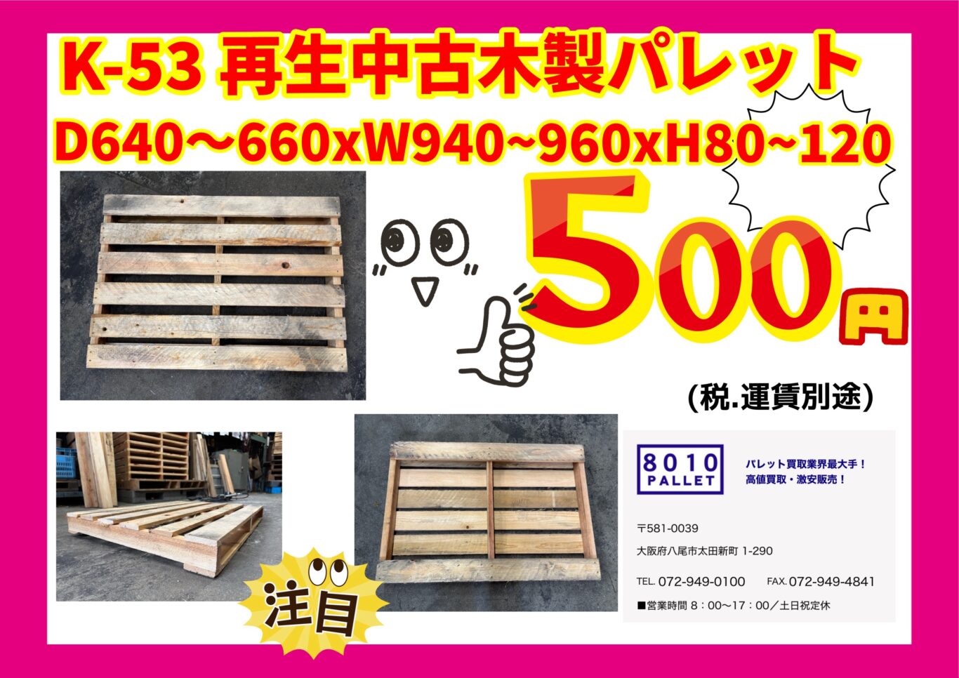 K-53 再生中古木製パレットD640∼660xW940∼960xH80∼120ハンドリフト使えません。※天板部(上面)の板と板の隙間は、埋まっていたり、1.2㎝開いています。写真ありませんが、桁(脚)は3本・4本さまざまです。サイズは、記載通りさまざまですが選べません。※中古材等を使用していますので、使用感・汚れ・割れ・欠け等あります。※個人様宅への配達、発送はできません。株式会社8010(パレット)パレット買取業界最大手!高値買取・激安販売!〒581-0039大阪府八尾市太田新町 1-290TEL: 072-949-0100FAX: 072-949-4841:info@8010-co.jpHP: https://8010-co.jp/■営業時間 8:00~17:00/土日祝定休